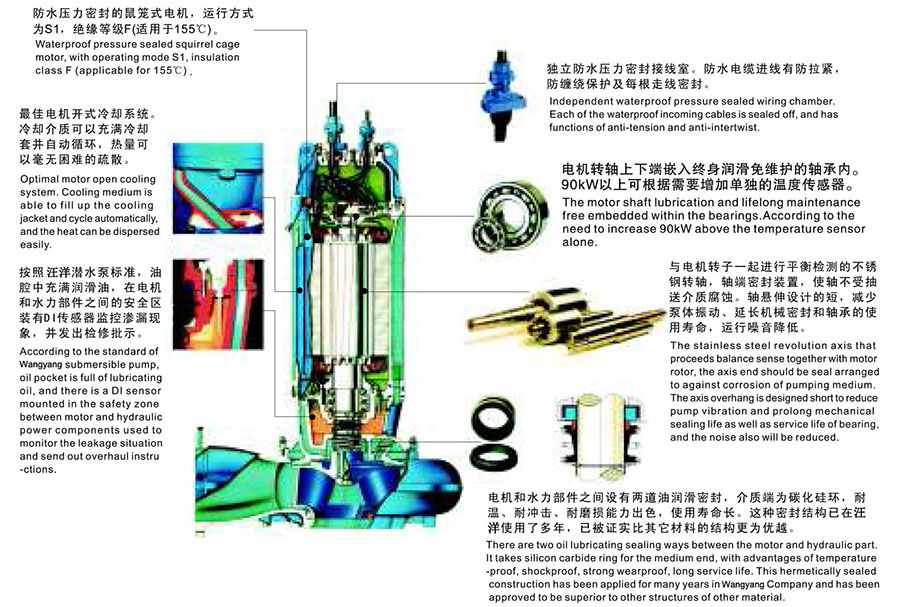 Esta bomba de esgoto submersível da série adota a tecnologia avançada dos países estrangeiros, tem uma estrutura razoável e um desempenho superior. O modo de funcionamento do motor de gaiola é S1. A classe de isolamento do estator é F (155C) .Com dispositivo resistente a condensação, e há elemento de proteção contra sobrecarga para cada fase.